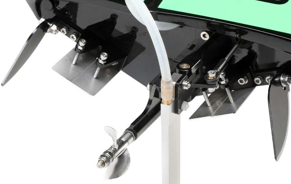 Both the adjustable stinger-style propeller strut and rudder feature hard anodized aluminum. The rudder has a special break away feature that protects the hull from damage in case floating debris is struck.