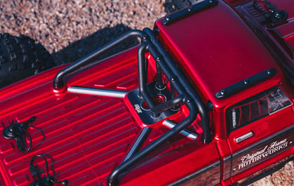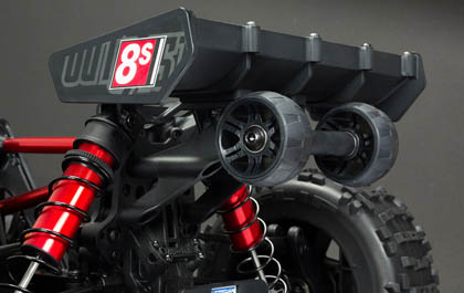 The extra-rigid, laser-etched, anodized aluminum chassis plate has a multi-structured center brace system, rear lower chassis brace and strong composite chassis side pods for the durability to support extreme stunts. Extra-thick molded composite front and rear shock towers hold massive 20mm bore, oil-filled adjustable shocks to soak-up bumps and jolts.