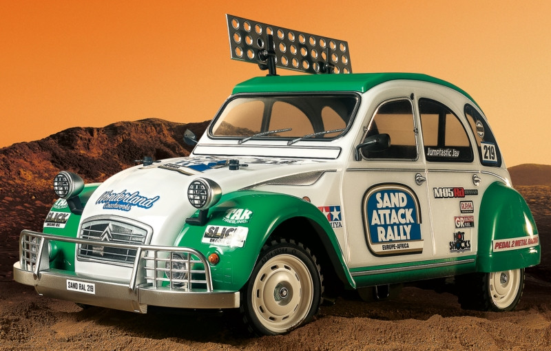 This TAMIYA R/C model assembly kit depicts the Citroën 2CV. The kit features a highly realistic recreation of the body, modified for rally races, and based upon a dedicated rally chassis in the form of the M-05Ra.