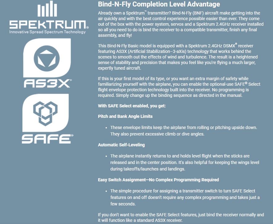 This Bind-N-Fly Basic model is equipped with a Spektrum 2.4GHz DSMX® receiver featuring AS3X (Artificial Stabilization–3-aXis) technology that works behind the scenes to smooth out the effects of wind and turbulence. The result is a heightened sense of stability and precision that makes you feel like you're flying a much larger, expertly tuned aircraft.